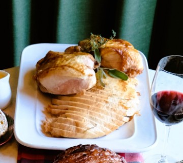 Glazed Ham, served with winter roasted vegetables, mashed potatoes, stuffing, cranberry sauce, and our signature homemade gravy.